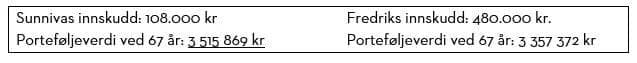 Selv om Fredrik sparer i 40 år etter at Sunniva stoppet sine innskudd klarer ikke hans portefølje å hente inn verdien til Sunnivas portefølje. Hennes portefølje er verdt ca. 161.000 kroner når Fredrik starter sin sparing, og rentesrente-effekten for Sunniva blir for kraftig i denne tidsperioden.