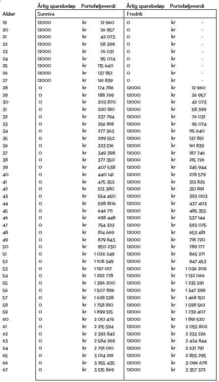 Sunniva starter å spare 1.000 kr i måneden i aksjefond det året hun fyller 19 år. Hun sparer i ni år og gjør deretter ingen flere innskudd. Hun lar kontoen stå urørt i tiden frem til hun er 67 år.