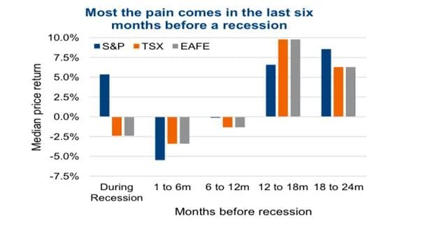Grafen under, hentet fra kanadiske Connected Wealth, illustrerer dette poenget ganske tydelig. Det er lett å lese ut en negativ avkastning frem mot selve resesjonstidspunktet, og tilsvarende økende avkastning ut av resesjonen igjen.