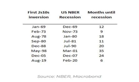 Nylig har dette værvarselet kommet; for en kort periode så vi at rentekurven inverterte i USA. Tiden fra resesjonssignal gis til resesjonen faktisk defineres som å ha begynt, varierer imidlertid betydelig. Dermed kan det fastslås at det å anvende resesjonssignaler som et verktøy for porteføljetilpasninger kan være vanskelig. Oversikten under, hentet fra Variant Perception, viser at fra tidspunktet der resesjonssignalet varsler til resesjonen faktisk starter, varierer med så mye som fra 6 måneder opp til 3 år. Resesjonssignalet er pålitelig, men med andre ord vanskelig og lite tilrådelig å bruke i praksis.