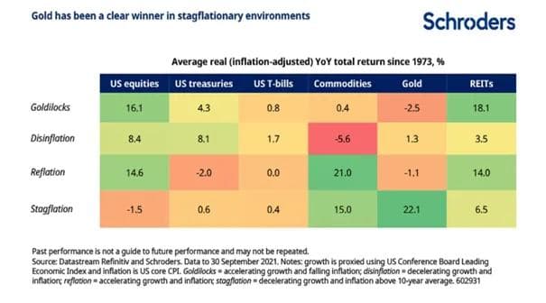 Til slutt skal vi ta en titt på en tabell jeg har hentet fra forvaltningsselskapet Schroders. Her viser de avkastningen, etter at det er justert for inflasjon, for ulike plasseringsalternativer gjennom fire ulike økonomiske faser.