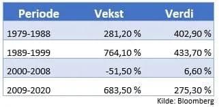 Det som er interessant å se er at fra 1979 og frem til i dag har vekst- og verdiindeksene hatt nærmest identisk avkastning. Med henholdsvis 12,1 % årlig gjennomsnittlig avkastning for vekst og 12 % for verdi.