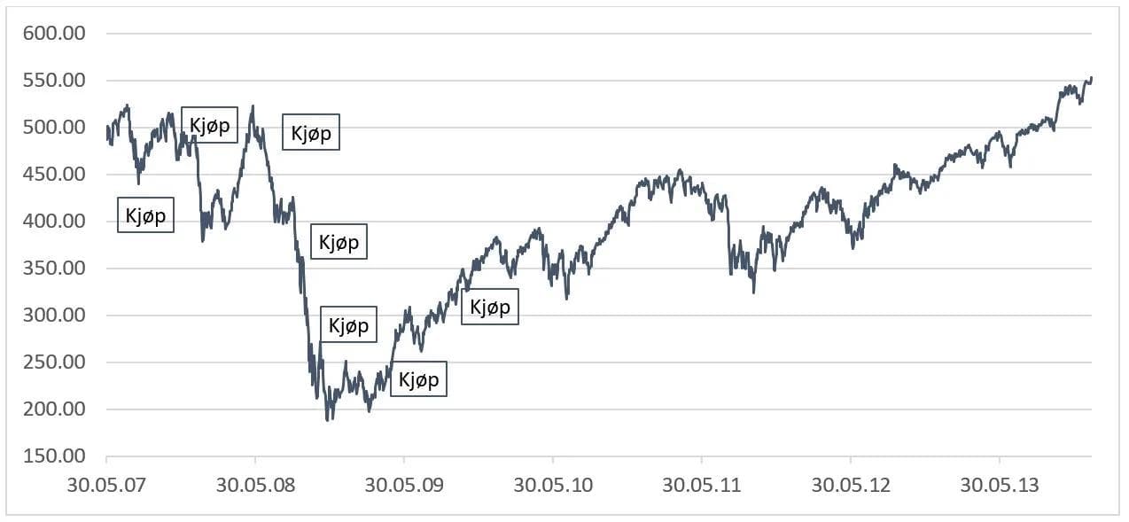 Dessverre er det dette, som dessverre er praktisk talt umulig. Og alt for ofte handler denne gjetningen om at man skal vente til ting er bra igjen. Om det er taktikken, har du sannsynligvis sett markedet ta av rett foran øynene dine. Erfaringen er at markedet alltid tar seg opp før økonomien «har kommet seg helt». Husk at det er millioner av andre som sannsynligvis tenker det samme som deg.
