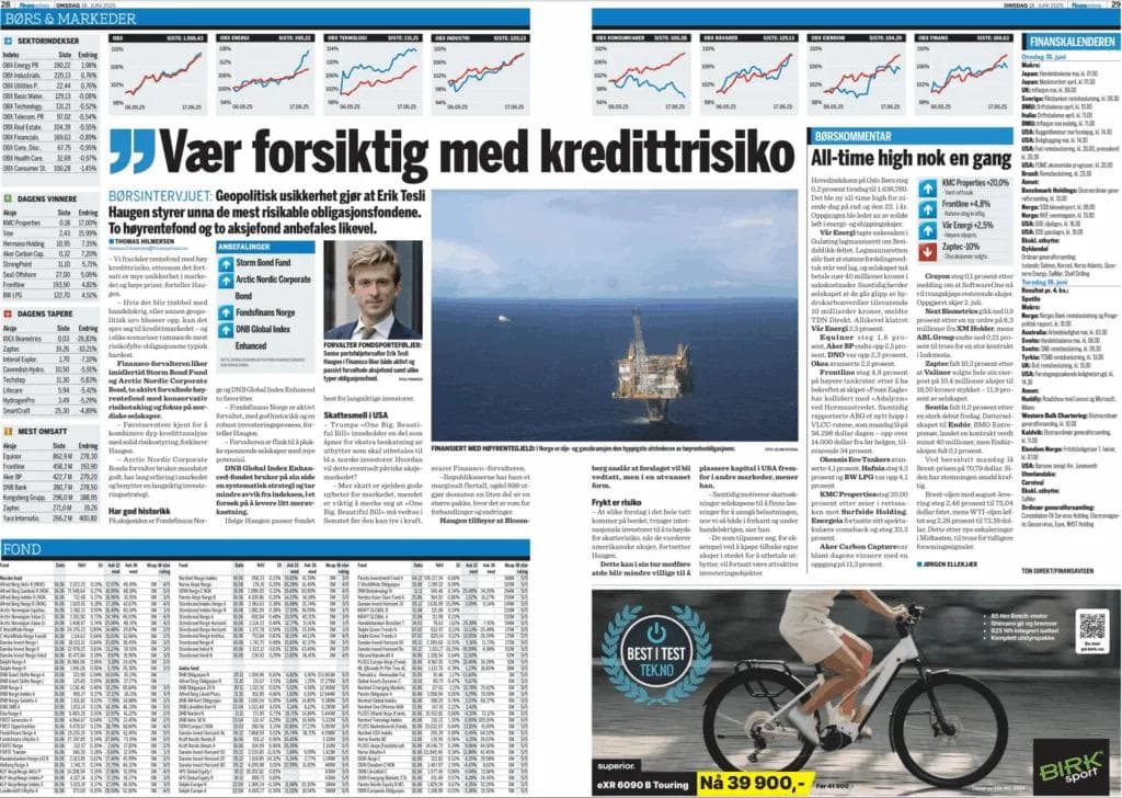 Geopolitisk usikkerhet gjør at Erik Tesli Haugen styrer unna de mest risikable obligasjonsfondene. To høyrentefond og to aksjefond anbefales likevel. Finansavisen, 17. juni.
