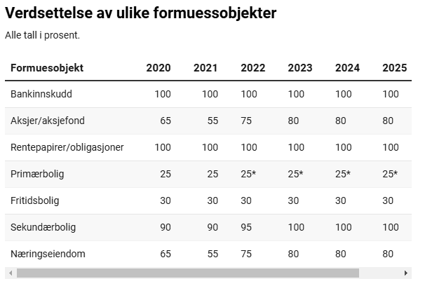 - Børsnoterte aksjer verdsettes til børskurs ved årsskiftet, og reduseres deretter til 80 prosent av denne markedsverdien for inntektsåret 2025.
