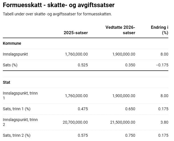 Av de få endringene som ble foreslått, og senere vedtatt, var det kun mindre endringer. Det er blant annet å øke bunnfradraget (fra 1,76 millioner kroner i 2025 til 1,9 millioner kroner i 2026) og innslagspunktet på 20,7-millionersgrensen (2025) er økt 21,5 millioner for 2026. I tillegg er det noen justeringer på fordelingen av satsen på formuesskatt (1 % / 1,1 %) mellom stat og kommune.
