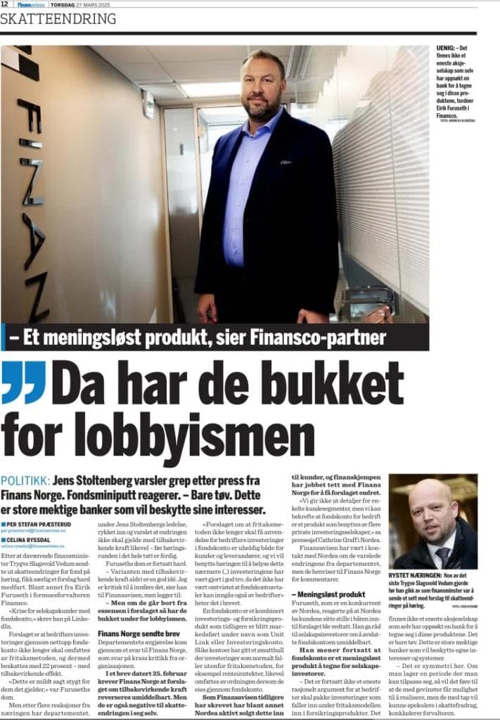 Om artikkelen i Finansavisen skriver gründer og partner i Finansco, Eirik Furuseth, følgende: