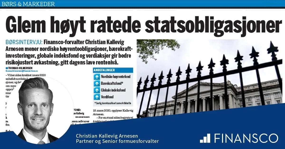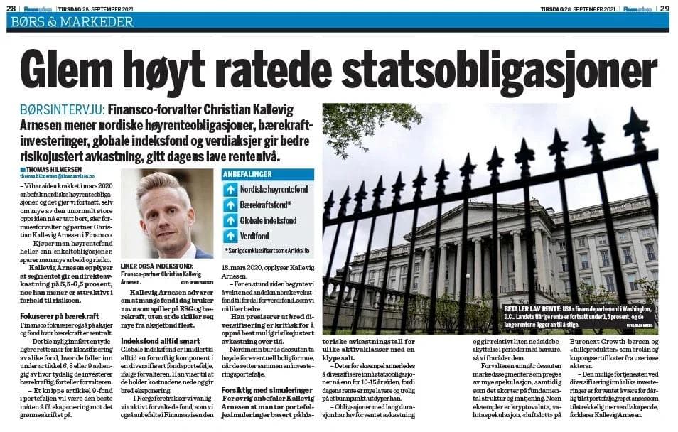 Finansco mener nordiske høyrenteobligasjoner, bærekraftinvesteringer, globale indeksfond og verdiaksjer gir bedre risikojustert avkastning, gitt dagens lave rentenivå. – Vi har siden krakket i mars 2020 anbefalt nordiske høyrenteobligasjoner, og det gjør vi fortsatt, selv om mye av den unormalt store oppsiden nå er tatt bort, sier formuesforvalter og partner Christian Kallevig Arnesen i Finansco.