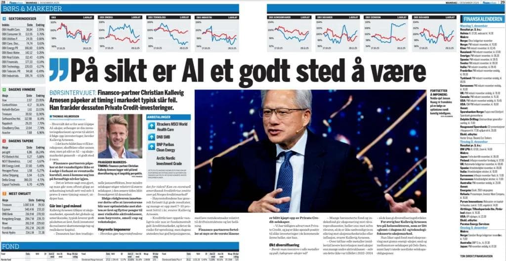 Finansco-partner Christian Kallevig Arnesen forteller at AI er et fornuftig investeringsobjekt med lang horisont. Finansavisen, mandag 1. desember