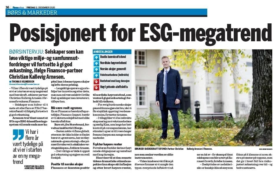 BØRSINTERVJU: Selskaper som kan løse viktige miljø- og samfunnsutfordringer vil fortsette å gi god avkastning, ifølge Finansco-partner Christian Kallevig Arnesen. – Vi har i flere år vært tydelige på at vi er i starten av en ny megatrend med bærekraft.