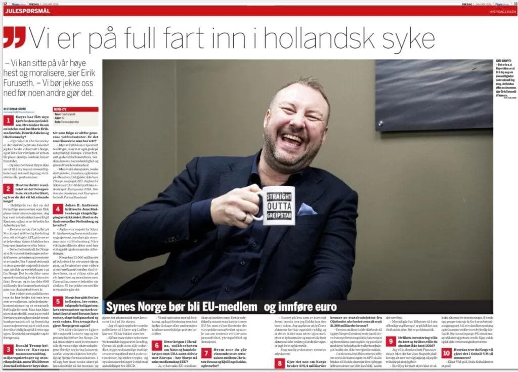 Gründeren vår startet 2026 med å svare på spørsmål om blant annet det nye Høyre, EU, norsk økonomi og Norges sjanser i VM til sommeren. Finansavisen, 1. januar.
