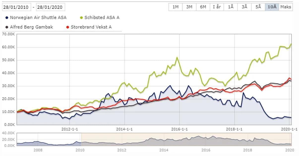 Schibsted-aksjen (grønn graf) og Norwegian-aksjen (blå graf) har beveget seg i ganske motsatt retning de siste ti år. Det de har til felles, er at de begge har svingt mye. To gode fond, Alfred berg Gambak (sort graf) og Storebrand Vekst (rød graf), har levert litt over 200% avkastning de siste ti år. De har svingt noe, men svært mye mindre enn aksjene, samtidig som de har gitt det de fleste vil argumentere for er god avkastning. Man kan argumentere for at man kunne ha gjort det mye bedre om man bare hadde investert i Schibsted aksjen for ti år siden, men da er vi tilbake på «griseflaks»-teorien igjen.