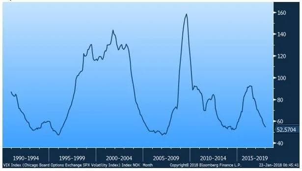 Den såkalte fryktindeksen som måler hvor store svingninger investorene forventer i markedet har ligget på rekordlave nivåer hele året. Normalt er prisen man må betale for å høste av aksjemarkedets verdiskapning store svingninger i porteføljens verdi. I 2017 fikk vi fantastisk verdistigning, og nesten ingen svingninger. Bedre blir det ikke!