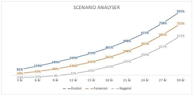 Har man derimot en tidshorisont på over 10 år på midlene som er plassert i et indeksfond kan man begynne å snakke om at risikoen ikke er høy lenger. Et scenario analyse som viser historisk avkastning og risiko (standardavvik) viser at med 93 % sannsynlighet vil avkastningen ligge mellom 0 % og 208 % etter 10 år. Om man har pengene plassert i et globalt indeksfond i 30 år vil avkastningen med 93 % sannsynlighet ligge mellom 572 % og 931 %. Det forutsetter selvfølgelig at man ikke får panikk og selger alt den dagen indeksfondet nesten har halvert seg i verdi.