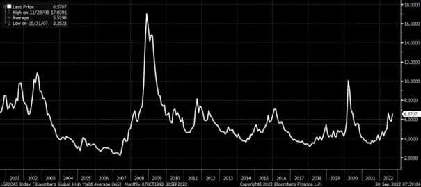 Jeg har ikke noen data for hva kredittpåslaget er i det nordiske høyrentemarkedet. Ser jeg på hvor kredittpåslaget for globale høyrenteobligasjoner er nå i forhold historikken de siste 20 årene, som vist nedenfor, så ser jeg at kreditt spreadene nå ligger på noe over det historisk snitt for de siste 20 årene. Det er faktisk kun under Corona pandemien, Finanskrisen og IT boblen at kredit tspreadene var høyere (og da mye mer). På lengre sikt er dette attraktive nivåer, men vi skal nok gjennom en fortsatt turbulent periode.
