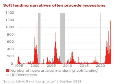 Jeg er ikke helt villig til å gi opp scenariet om en mulig resesjon ennå. Selv om det ikke er vårt hovedscenarie for 2023, så er jeg fortsatt på vakt for muligheten at det kan skje. Grafen under, som jeg nylig fant, understøtter dette. Grafen viser sammenhengen om hvor ofte utrykket «soft landing» nevnes og om og når en resesjon inntreffer. Dette er et eksempel hva man i finansteorien kaller «confirmation bias». Her leter man etter data og annen informasjon som bekrefter det syn en allerede har og ikke evner til å endre ens oppfatning.
