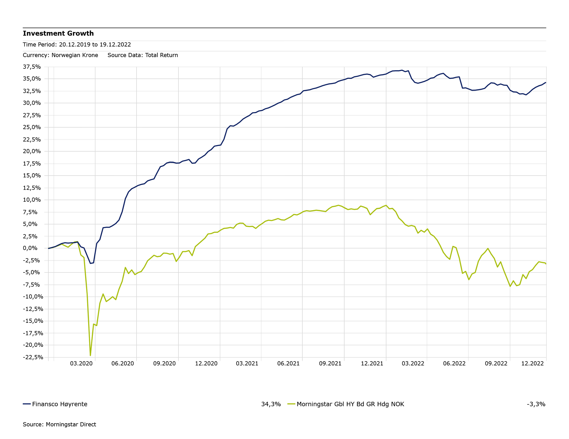 Vi har lagt bak oss et år som har vært sterkt preget av en grufull krig i Europa. Putin-regimets folkerettsstridige overfall på sitt naboland har vært medvirkende årsak til galopperende inflasjon, ekstreme strømpriser og fallende aksje- og obligasjonsmarkeder. Selv om dette påvirker vår hverdag negativt bærer den heltemodige befolkningen i Ukraina den største børa, og betaler den desidert høyeste prisen. Men krigen har også vist at de vestlige demokratiene står samlet når de blir testet, og omstillingen fra petro-økonomi og fossil energi går nå fremover fortere enn den ville gjort uten krigen. Prisen vi betaler for den ekstra avkastningen vi får i aksje- og høyrentefond er svingninger underveis, og av og til må vi tåle hele år med negativ avkastning. Jeg er glad for at ingen av Finansco sine kunder har fått råd om å foreta investeringer som kan gi «totalt tap» hos oss, og holder man seg til Formuesplanen Finansco har laget vil verdifall være av forbigående karakter.