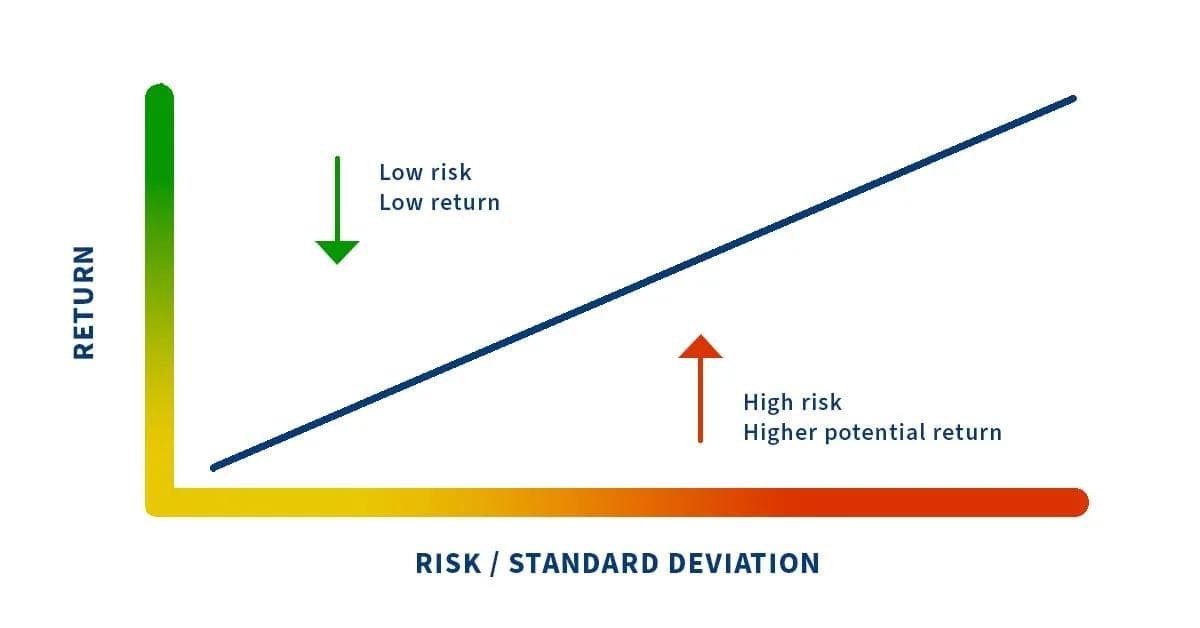 Jeg sparker antagelig inn åpne dører, men det er likevel greit å valse ut dette begrepet til vi forstår hva investeringer handler om i kjerne. Uten å ta risiko blir det liten eller ingen avkastning. Risiko har to sider, en oppside og en nedside. Jo mer risiko man er villig til å ta i sine investeringer, desto høyere avkastning skal man forvente. Det blir ikke alltid slik, men på lang sikt er sammenhengen mellom avkastning og risiko slik det blir illustrert i den forenklede grafen under.